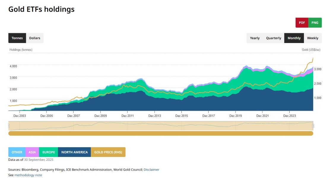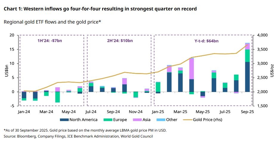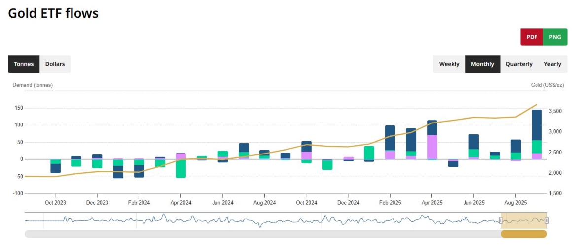 Τα παγκόσμια ETFs φυσικού χρυσού κατέγραψαν τον Σεπτέμβριο 2025 τη μεγαλύτερη μηνιαία εισροή τους, φτάνοντας στα 26 δισ. δολάρια, ενώ το τρίτο τρίμηνο συνολικά σφραγίστηκε ως το ισχυρότερο όλων των εποχών.