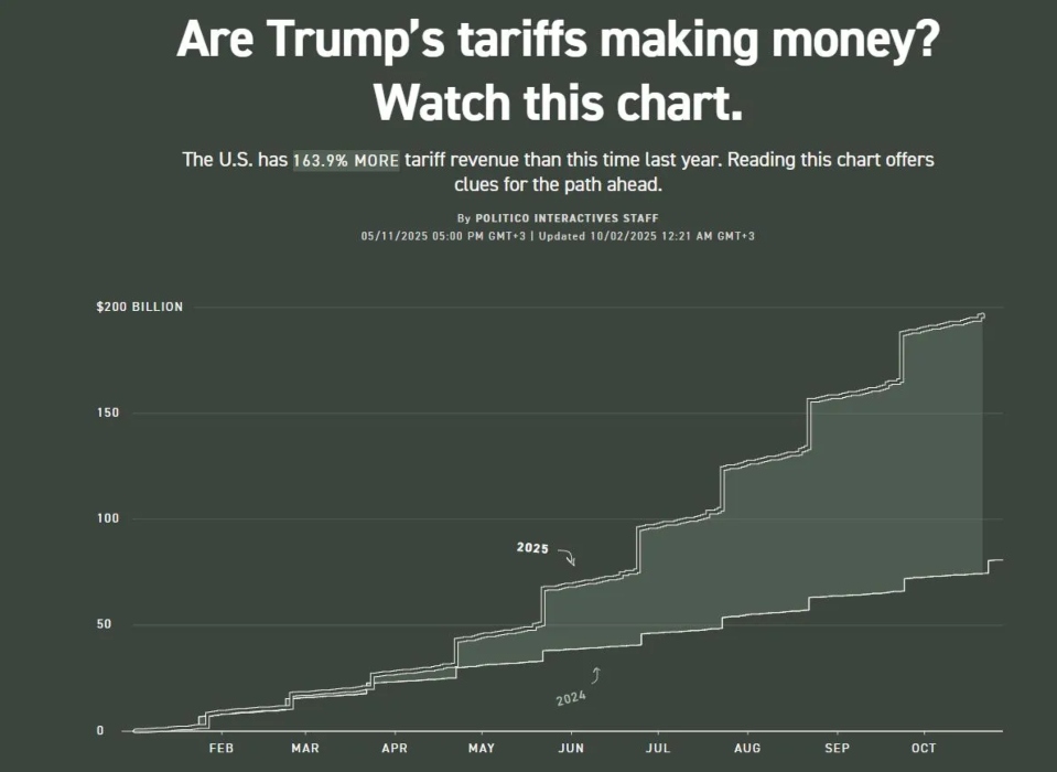 Σύμφωνα με τα τελευταία στοιχεία του Penn Wharton Budget Model, που παρακολουθεί το Politico μέσω ενός συνεχούς γραφήματος, τα έσοδα από δασμούς εισαγωγών έχουν αυξηθεί κατά 163,9% σε σχέση με πέρυσι, φτάνοντας τα 196,5 δισεκατομμύρια δολάρια έως τις 21 Οκτωβρίου 2025.