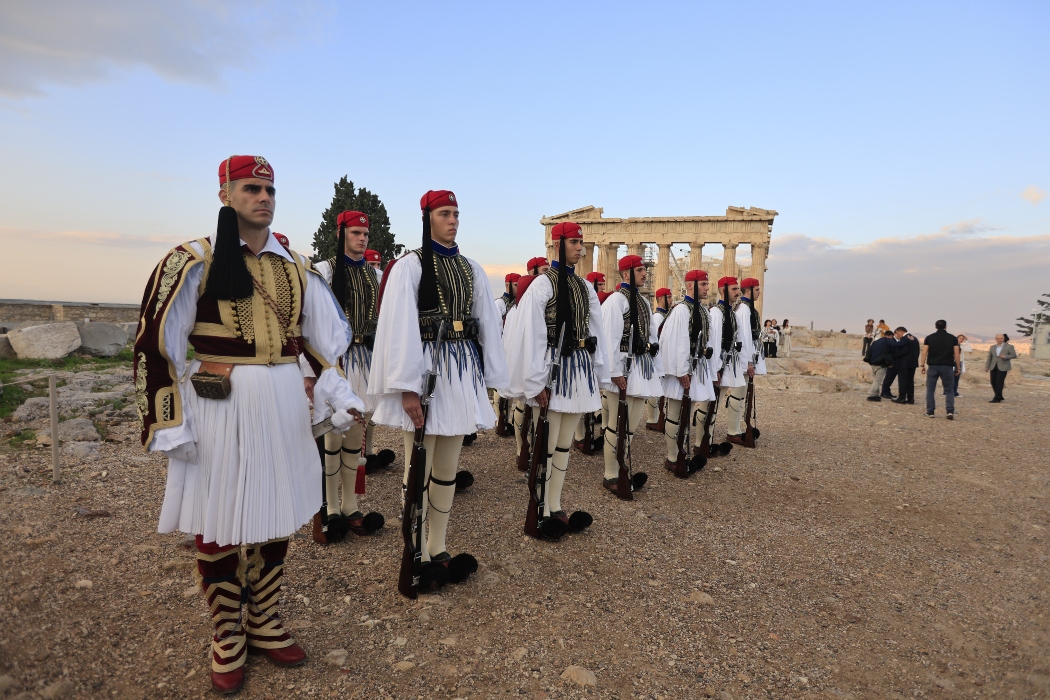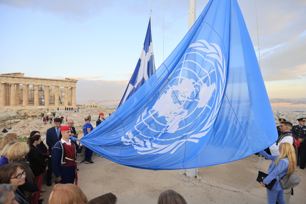 Τελετή στην Ακρόπολη για την 80ή επέτειο από την ίδρυση των Ηνωμένων Εθνών, με έπαρση της σημαίας του Οργανισμού παράλληλα με την ελληνική σημαία.