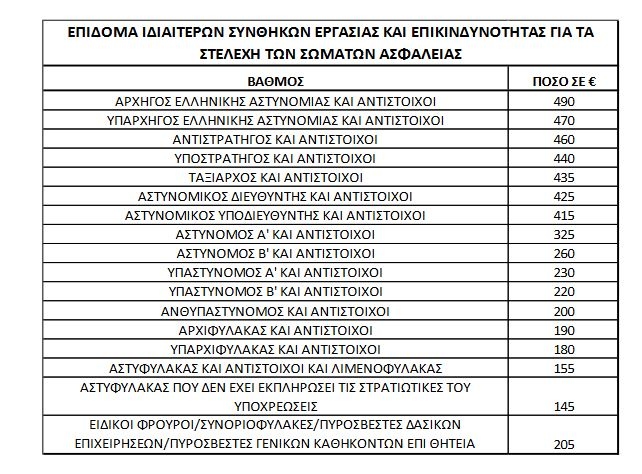 β) Επίδομα ιδιαίτερων συνθηκών εργασίας και επικινδυνότητας. Καταβάλλεται λόγω της φύσης της αποστολής, της επικινδυνότητας, της ετοιμότητας και της απασχόλησης χωρίς τυπικό ωράριο ή πέραν αυτού. Το ύψος του επιδόματος εξαρτάται από τον βαθμό. Ειδικότερα για τον Αρχηγό προβλέπεται ποσό της τάξεως των 490 ευρώ, για τον Υπαρχηγό 470 ευρώ, για Αντιστράτηγο 460 ευρώ, για Υποστράτηγο 440 ευρώ, για Ταξίαρχο 435 ευρώ και 415 ευρώ για Αστυνομικό Υποδιευθυντή. Για προσωπικό όπως οι ειδικοί φρουροί, συνοριοφύλακες και πυροσβέστες δασικών επιχειρήσεων/γενικών καθηκόντων επί θητεία το επίδομα ανέρχεται σε 205 ευρώ.