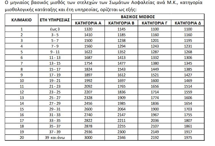 Ο μηνιαίος βασικός μισθός των στελεχών των Σωμάτων Ασφαλείας καθορίζεται ανά μισθολογικό κλιμάκιο, κατηγορία μισθολογικής κατάταξης και έτη υπηρεσίας.