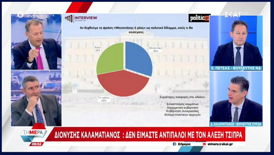 Στην πράξη, οι πολίτες φαίνεται να θέλουν μια σταθερή κυβέρνηση, με την πρόθεση ψήφου να δείχνει 42% για το «χάος» και 30% για τον Κυριάκο Μητσοτάκη. «Απέναντι σε αυτό, η Νέα Δημοκρατία παρουσιάζει σοβαρή και υπεύθυνη πρόταση, ενώ το προοδευτικό πεδίο προσπαθεί να βρει κοινό τόπο», σημείωσε ο Πέτσας.