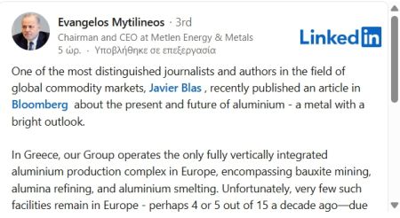 Ο Ευάγγελος Μυτιληναίος, πρόεδρος και CEO της METLEN και επικεφαλής της Eurometaux, τόνισε σε ανάρτησή του στα κοινωνικά δίκτυα ότι η παραγωγή αλουμινίου στην Ευρώπη έχει υποστεί σημαντική συρρίκνωση. Σύμφωνα με τον ίδιο, από τις 15 καθετοποιημένες εγκαταστάσεις που υπήρχαν πριν από μια δεκαετία, σήμερα έχουν απομείνει μόλις 4 ή 5, και καμία από αυτές δεν είναι πλήρως ολοκληρωμένη όπως η ελληνική. Το υψηλό κόστος ενέργειας λειτουργεί ως βασικός ανασταλτικός παράγοντας, θέτοντας σε κίνδυνο τη βιωσιμότητα της βιομηχανίας.