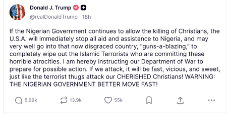 Τραμπ: Νιγηρία «country of particular concern» (CPC) για θρησκευτική ελευθερία. Επιπλέον, χιλιάδες Χριστιανοί σκοτωμένοι. Ωστόσο, χωρίς στοιχεία. Ted Cruz: «Mass murder». USCIRF: προτείνει CPC. Τραμπ: «Αν επιτεθούμε, guns-a-blazing, εξουδετερώσουμε ισλαμιστές τρομοκράτες».
