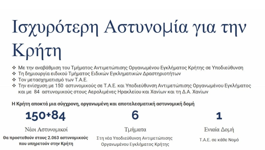 Η Διεύθυνση Αντιμετώπισης Οργανωμένου Εγκλήματος αποκτά στην Κρήτη Υποδιεύθυνση με 122 αστυνομικούς, πανελλαδική αρμοδιότητα και πλήρη επιχειρησιακή δυναμική.