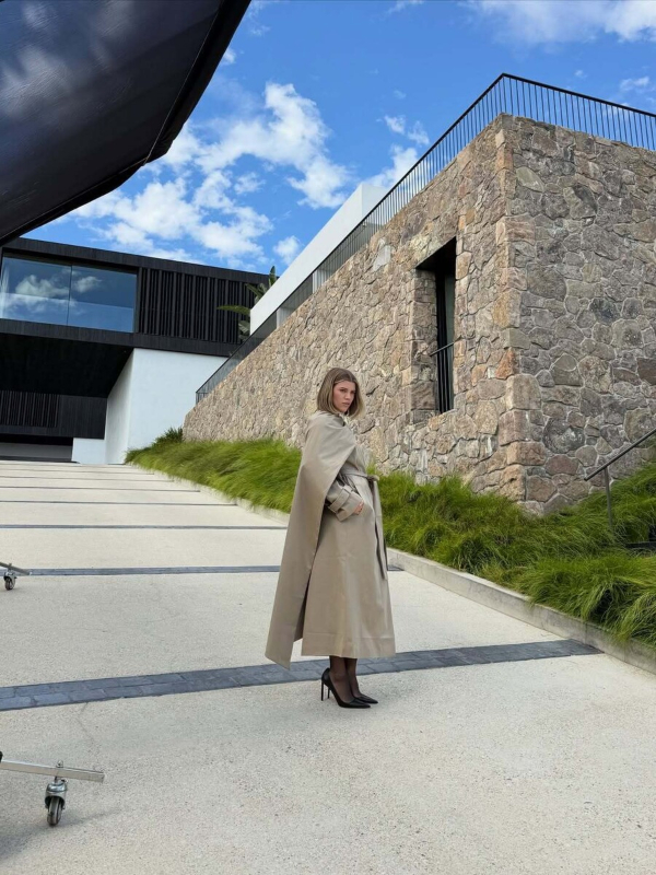 Το παλτό, σε maxi μήκος μέχρι τον αστράγαλο, διέθετε ενσωματωμένο φουλάρι που έπεφτε φυσικά στους ώμους, δημιουργώντας καθαρή σιλουέτα χωρίς περιττά στοιχεία.