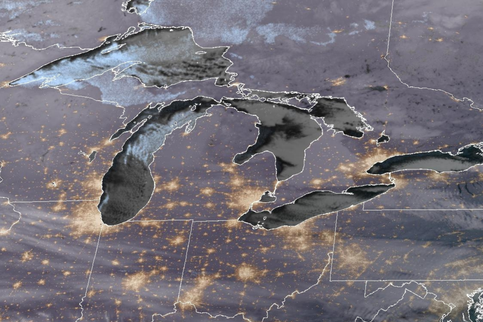 Δορυφορικές εικόνες δείχνουν ζώνες χιονιού να «σχηματίζονται» πάνω από τις λίμνες, με άνεμους που εντείνουν το φαινόμενο. Χειμωνιάτικες προειδοποιήσεις σε Μίσιγκαν, Ουισκόνσιν, Ιντιάνα, με διακοπές ρεύματος και κλειστούς δρόμους.