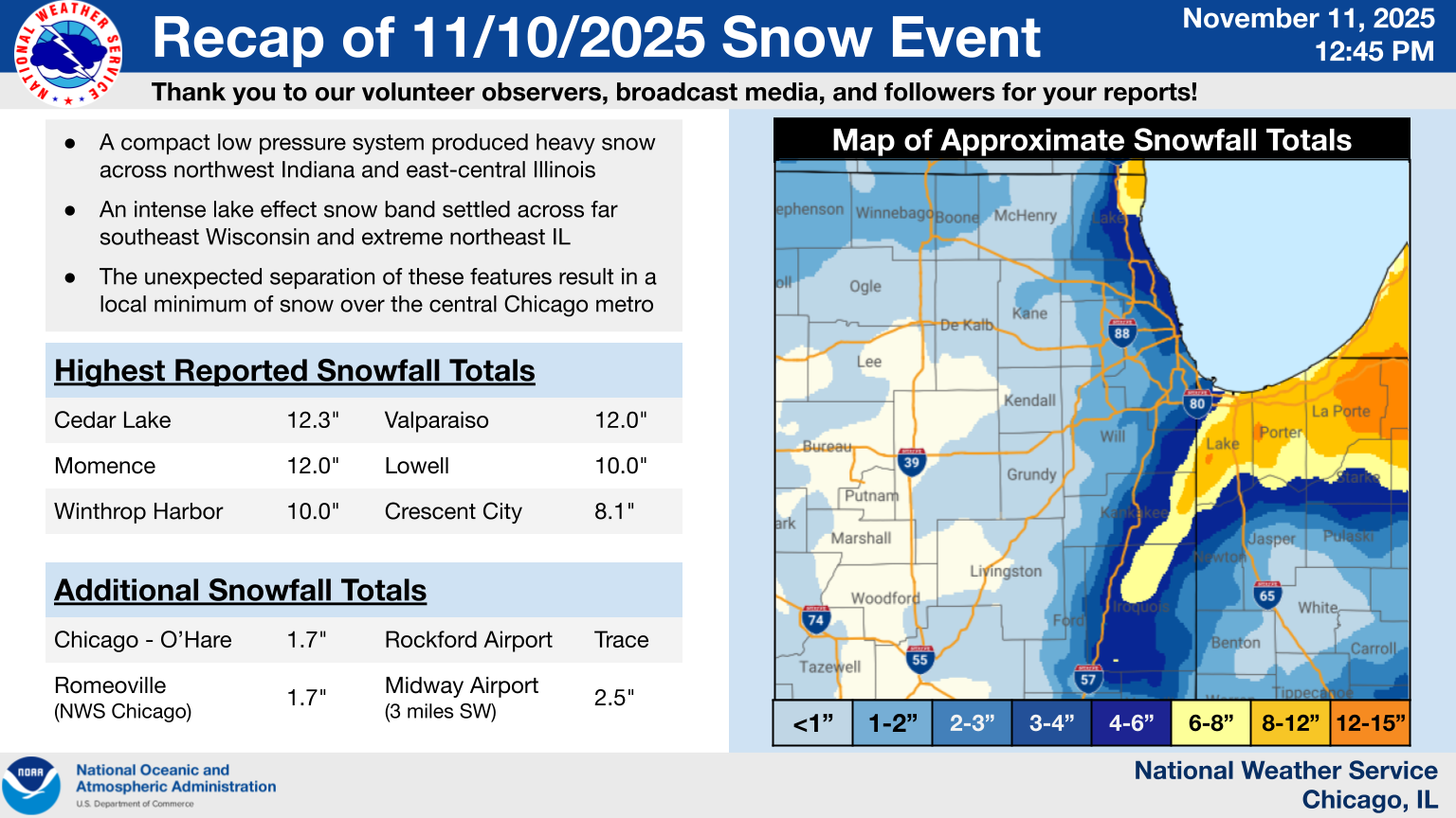 Το φαινόμενο lake-effect snow ενεργοποιήθηκε για πρώτη φορά φέτος στις Μεγάλες Λίμνες, με στενές ζώνες χιονιού να πέφτουν τοπικά. Ρεκόρ: