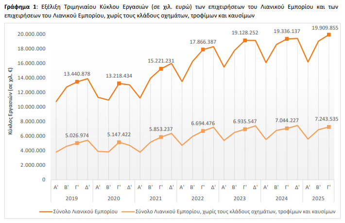 Η Ελληνική Στατιστική Αρχή έδωσε σήμερα (21/11/2025) τα επίσημα στοιχεία και η εικόνα είναι ξεκάθαρα θετική: Ο κύκλος εργασιών του λιανικού εμπορίου έφτασε τα 19,909 δισ. ευρώ το γ’ τρίμηνο 2025, σημειώνοντας: