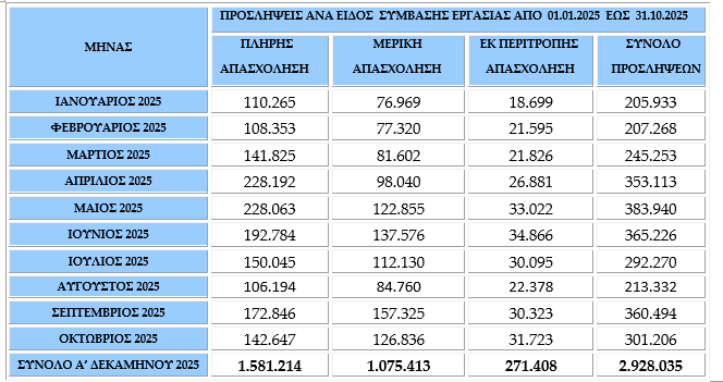 Παρά το εποχικό σοκ, το ισοζύγιο Ιανουαρίου-Οκτωβρίου παραμένει θετικό κατά 188.086 θέσεις (2.928.035 προσλήψεις – 2.739.949 αποχωρήσεις). Ωστόσο, η ποιότητα παραμένει προβληματική: πάνω από τις μισές νέες θέσεις είναι ευέλικτες και χαμηλόμισθες.
