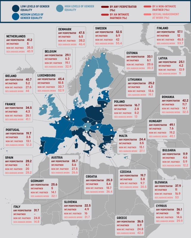 Σύμφωνα με έρευνα του Eurostat, FRA και EIGE (2024), μία στις τρεις γυναίκες στην ΕΕ έχει υποστεί σωματική ή σεξουαλική βία από τα 15 της χρόνια. Το 17% δηλώνει ότι έχει υποστεί σεξουαλική βία, το 32% ψυχολογική βία από σύντροφο και το 13,6% παρενόχληση.