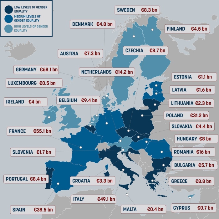 Σύμφωνα με το EIGE, η πλήρης ισότητα των φύλων θα μπορούσε να αυξήσει το κατά κεφαλήν ΑΕΠ της ΕΕ κατά 6,1–9,6% έως το 2050, προσθέτοντας ουσιαστικά μια οικονομία μεγαλύτερη από αυτή της Ισπανίας.