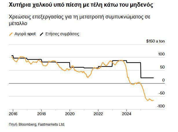 Οι εταιρείες εξόρυξης χαλκού άσκησαν πρωτοφανή πίεση στα χυτήρια και τις μεταλλουργίες, διεκδικώντας τα χαμηλότερα τέλη επεξεργασίας μεταλλευμάτων (treatment charges) που έχουν ποτέ καταγραφεί. Την ίδια στιγμή, για το εξευγενισμένο μέταλλο που αποστέλλεται στην Κίνα, τα ετήσια ασφάλιστρα (premiums) εκτινάχθηκαν σε ιστορικά υψηλά, αποτυπώνοντας την έντονη ζήτηση για ποιοτικό επεξεργασμένο προϊόν σε ένα περιβάλλον περιορισμένης προσφοράς.