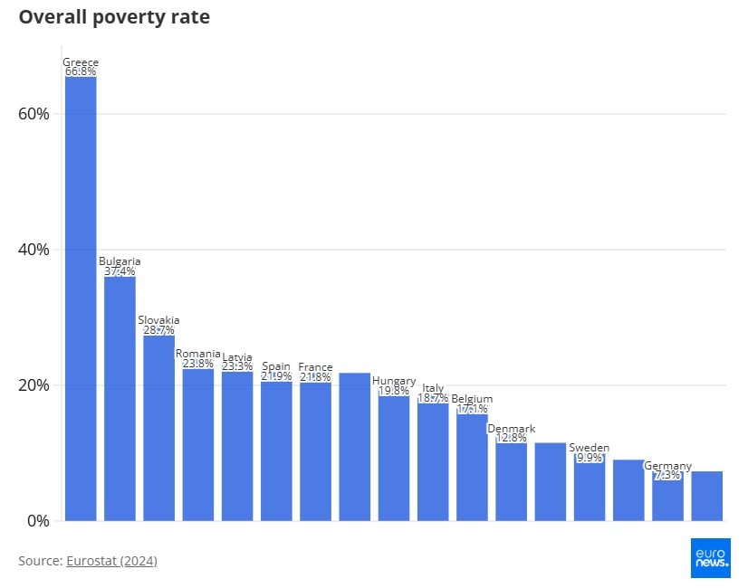 Σε αυτό το πλαίσιο, η Ελλάδα εμφανίζεται να κινείται με βαρύ βηματισμό. Παρά την αποκλιμάκωση κατά 10,9%, παραμένει η χώρα με το υψηλότερο ποσοστό φτώχειας, αφήνοντας πίσω της ακόμη και χώρες που μέχρι πρόσφατα θεωρούνταν «φτωχοί συγγενείς» της Ένωσης.