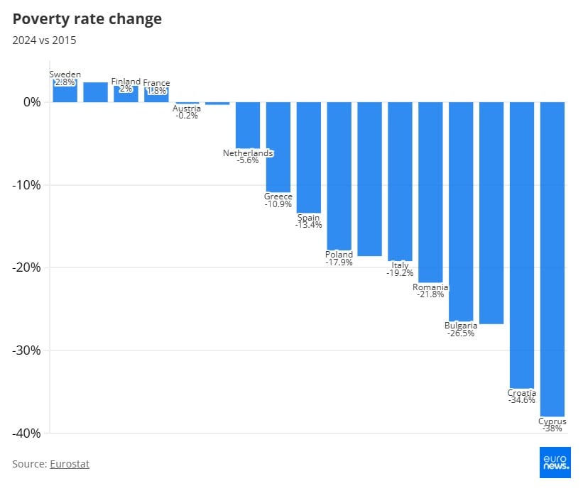 Παράλληλα, ένα άλλο κομμάτι της Ευρώπης δείχνει να κινείται σε αντίθετη κατεύθυνση. Χώρες της Ανατολικής και Νότιας Ευρώπης έχουν καταφέρει σημαντικές μειώσεις στα ποσοστά φτώχειας την τελευταία δεκαετία, διαψεύδοντας όσους τις θεωρούσαν μόνιμα «ουραγούς».