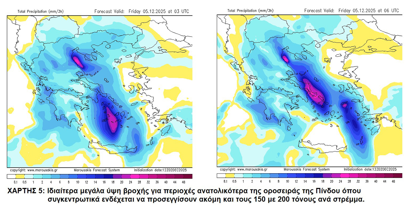 Επισημαίνεται πως οι βροχοπτώσεις εκτός της μεγάλης έντασης θα έχουν και μεγάλη διάρκεια. Τα ισχυρά φαινόμενα σε πολλές περιοχές θα συνοδεύονται από τοπικές χαλαζοπτώσεις και κατά διαστήματα από πολύ ισχυρούς ανέμους, η ένταση των οποίων την Παρασκευή (05-12-2025) στη νοτιοανατολική νησιωτική χώρα θα φτάσει τα 8 και πιθανώς πρόσκαιρα τα 9 μποφόρ.