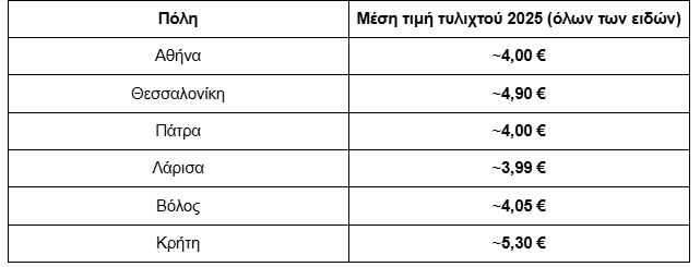 Αν δούμε συνολικά τα στοιχεία, προκύπτει ένα ξεκάθαρο μοτίβο. Λάρισα, Πάτρα, Αθήνα και Βόλος παραμένουν οι πιο «φιλικές» πόλεις για τον λάτρη του τυλιχτού, με τις μέσες τιμές να κινούνται κοντά στα 4 ευρώ. Από την άλλη, Θεσσαλονίκη και –κυρίως– Κρήτη ξεχωρίζουν ως οι πιο ακριβές περιοχές, με τη μέση τιμή να πλησιάζει ή και να ξεπερνά τα 5 ευρώ.