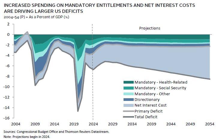Η παρατήρησή του αποτυπώνει το κεντρικό πρόβλημα: οι δασμοί μπορεί να ενισχύουν προσωρινά τα έσοδα, αλλά δεν αντιμετωπίζουν τη δομική ανισορροπία στο αμερικανικό δημοσιονομικό μοντέλο.