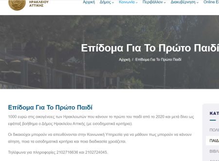 Ο Δήμος Ηρακλείου Αττικής είναι ο πρώτος δήμος της χώρας που, ήδη από το 2020, έχει θεσπίσει ένα σημαντικό οικονομικό κίνητρο για τη στήριξη των νέων οικογενειών: το εφάπαξ επίδομα των 1.000 ευρώ σε δημότες και κατοίκους που αποκτούν το πρώτο τους παιδί. Η πρωτοβουλία αυτή εντάσσεται στη συνολική στρατηγική του δήμου για την αντιμετώπιση της υπογεννητικότητας και τη στήριξη των νέων ζευγαριών, δίνοντας μια πολύτιμη ανάσα στα πρώτα έξοδα που συνοδεύουν τον ερχομό ενός παιδιού.