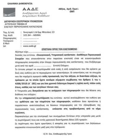 Η Ανεξάρτητη Αρχή Δημοσίων Εσόδων ξεκινά έναν πρωτοφανή κύκλο ελέγχων σε βάθος για τους ίδιους τους υπαλλήλους της. Μετά από σχεδόν 1.500 επώνυμες καταγγελίες, οι οικονομικοί επιθεωρητές καλούνται να εξετάσουν λεπτομερώς κάθε στοιχείο περιουσιακής κατάστασης, από τραπεζικούς λογαριασμούς και ακίνητα, μέχρι δαπάνες ζωής και οικογενειακές μεταβιβάσεις.