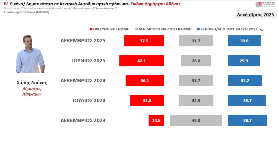 Ιδιαίτερα εντυπωσιακή είναι η μείωση των αρνητικών γνώμων: από 42,1% τον Ιούνιο του 2024 υποχώρησαν στο 37,5%, στοιχείο που υποδηλώνει ότι η κοινωνία βλέπει με θετικό μάτι τη διαχείριση της καθημερινότητας και τις πρωτοβουλίες που αναλαμβάνει ο Δούκας. Το ποσοστό αυτό είναι ιδιαίτερα υψηλό, λαμβάνοντας υπόψη και την πολιτική ταυτότητα του Δούκα και τη σχέση του με το ΠΑΣΟΚ, το οποίο αυτήν τη στιγμή αντιμετωπίζει προκλήσεις σε εθνικό επίπεδο.