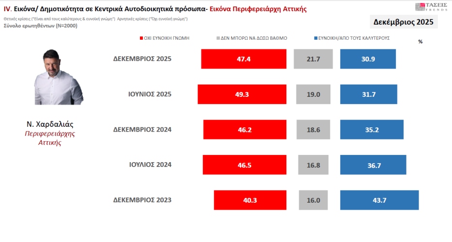 Αντίστοιχα, ο Νίκος Χαρδαλιάς, περιφερειάρχης Αττικής, εμφανίζει θετικές γνώμες 30,9%, σχεδόν ίδιες με αυτές του Δούκα, αν και ξεκινά από διαφορετική πολιτική και κομματική αφετηρία. Οι αρνητικές γνώμες για τον Χαρδαλιά μειώθηκαν από 49,3% σε 47,4%, καταγράφοντας μια μικρή αλλά σταθερή βελτίωση και δείχνοντας ότι η κοινωνία εκτιμά την παρουσία και τη διαχείριση κρίσεων που έχει αναλάβει στο επίπεδο της Περιφέρειας.