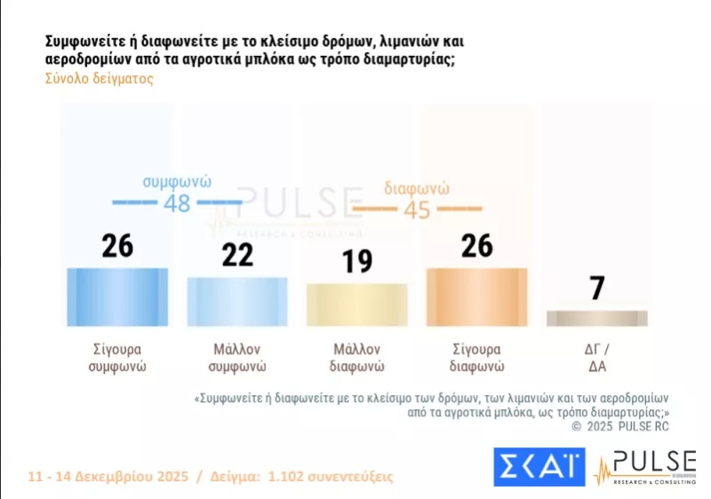 Μια ξεκάθαρη εικόνα ξετυλίγεται από την τελευταία δημοσκόπηση της Pulse: περίπου 8 στους 10 πολίτες (79%) συμφωνούν με τα αιτήματα και τους λόγους διαμαρτυρίας των αγροτών, με συνολική αποδοχή είτε πλήρη είτε εν μέρει των θέσεών τους. Η στήριξη αυτή εκτείνεται πέρα από τα παραδοσιακά πολιτικά τείχη, με θετικά ποσοστά ακόμη και μεταξύ ψηφοφόρων της Νέας Δημοκρατίας (περίπου 15% συμφωνεί) – ένα στοιχείο που μαρτυρά τη διεύρυνση της κοινωνικής συμπάθειας προς το αγροτικό κίνημα.