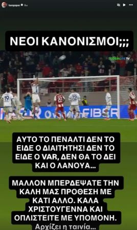 Ο Καραπαπάς έγραψε για τη συγκεκριμένη φάση: «Νέοι κανονισμοί;;; Αυτό το πέναλτι δεν το είδε ο διαιτητής! Δεν το είδε ο VAR, δεν θα το δει και ο Λανουά… Μάλλον μπερδέψατε την καλή μας πρόθεση με κάτι άλλο. Καλά Χριστούγεννα και οπλιστείτε με υπομονή. Αρχίζει η ταινία».