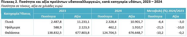 Η υδατοκαλλιέργεια το 2024 παρουσίασε σημαντική συρρίκνωση σε παραγωγή, εκτάσεις και απασχόληση, κυρίως λόγω οικονομικών πιέσεων, ανταγωνισμού και αύξησης κόστους. Παρά την πτώση της ποσότητας, η αξία παρέμεινε σχεδόν σταθερή χάρη σε υψηλότερες τιμές σε ορισμένα είδη (π.χ. καρκινοειδή). Ο κλάδος παραμένει στρατηγικός για τις εξαγωγές, αλλά χρειάζεται στήριξη για να ανακάμψει.