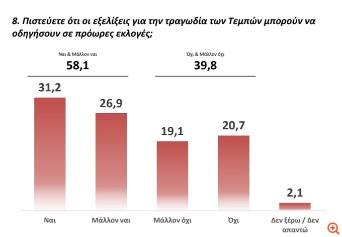 Ένα από τα πιο ενδιαφέροντα στοιχεία της έρευνας είναι ότι περίπου 58,1% των πολιτών εκτιμούν πως οι εξελίξεις στην υπόθεση των Τεμπών — και ειδικά η διαχείρισή τους από την κυβέρνηση — μπορεί να οδηγήσουν σε πρόωρες εκλογές. Η εκτίμηση αυτή, αν επιβεβαιωθεί, αποτελεί μια βαριά σκιά για την κυβερνητική σταθερότητα και ενισχύει το αφήγημα των πολιτικών αντιπάλων ότι «η κοινωνία έχει φτάσει σε οριακό σημείο».
