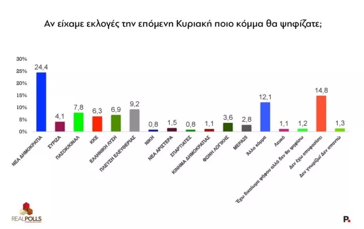 Στην πρόθεση ψήφου, τα ποσοστά εμφανίζονται χαμηλότερα, με τη ΝΔ να συγκεντρώνει 24,4% και την αβεβαιότητα να παραμένει έντονη, καθώς οι αναποφάσιστοι αγγίζουν το 14,8%, ενώ το 12,1% δηλώνει ότι θα ψήφιζε «άλλο κόμμα».