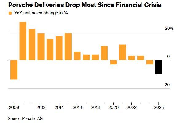 Η Porsche κατέγραψε το 2025 τη μεγαλύτερη ετήσια πτώση πωλήσεων από την παγκόσμια χρηματοπιστωτική κρίση του 2009, με τις συνολικές παραδόσεις να μειώνονται κατά 10% σε σχέση με το προηγούμενο έτος. Η εταιρεία παρέδωσε 279.449 οχήματα παγκοσμίως, σύμφωνα με τα επίσημα στοιχεία που ανακοίνωσε την Παρασκευή, σηματοδοτώντας μια δύσκολη χρονιά για την premium μάρκα του ομίλου Volkswagen, η οποία βασίζεται σε μεγάλο βαθμό στα υψηλά περιθώρια κέρδους των μοντέλων Porsche και Audi.