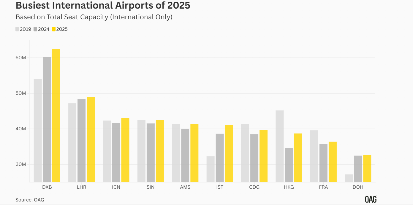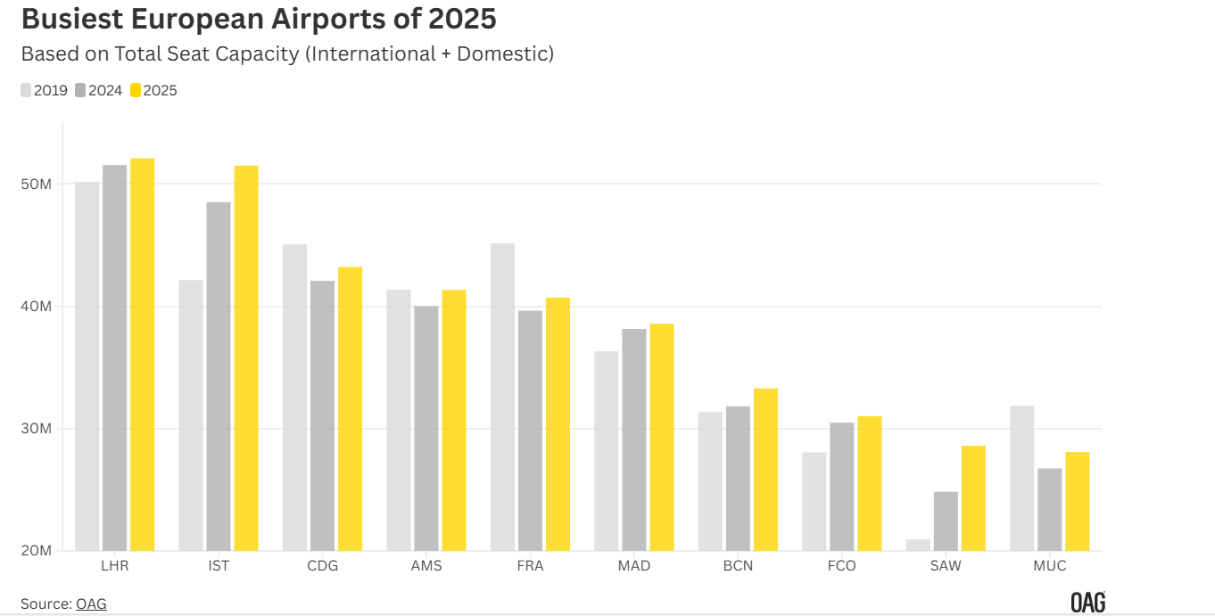 Στην ευρωπαϊκή κατάταξη, το Χίθροου παραμένει πρώτο με 52,1 εκατ. θέσεις (+1% από 2024, +4% από 2019). Η Κωνσταντινούπολη (IST) ακολουθεί δεύτερη με 51,5 εκατ. (+6% από 2024, +22% από 2019 – η μεγαλύτερη μακροπρόθεσμη άνοδος στην Ευρώπη). Το Charles de Gaulle (CDG) είναι τρίτο με 43,2 εκατ. (+3% από 2024, αλλά ακόμα -4% από 2019).