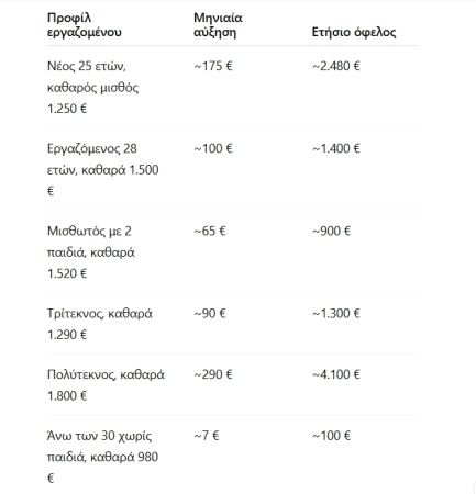 Οι καθαρές αυξήσεις κυμαίνονται από λίγα ευρώ τον μήνα για χαμηλόμισθους χωρίς παιδιά, έως και εκατοντάδες ευρώ για νέους εργαζόμενους και οικογένειες με τέκνα, με το ετήσιο όφελος σε ορισμένες περιπτώσεις να ξεπερνά ακόμη και τα 4.000 ευρώ.