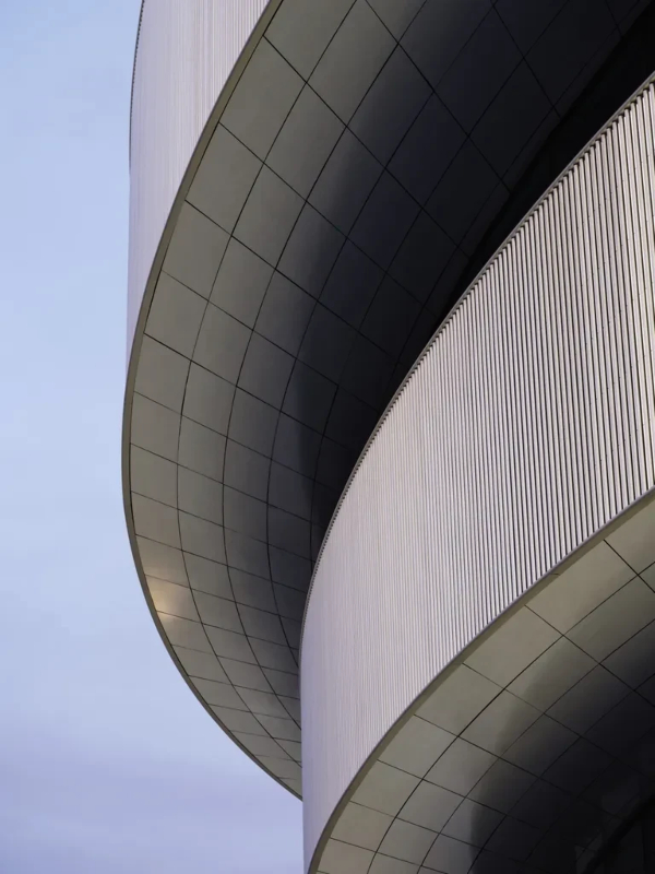 Στην κορυφή του βάθρου αποκαλύπτεται η χαρακτηριστική μορφή της αρένας. Το εξωτερικό της οργανώνεται σε τρεις οριζόντιους δακτυλίους, που δίνουν την αίσθηση ότι αιωρούνται ο ένας πάνω από τον άλλον. Οι δακτύλιοι αυτοί σχηματίζονται από σωληνωτές κατασκευές αλουμινίου, δημιουργώντας ένα ελαφρύ, ημιδιαφανές «πέπλο» γύρω από το κτίριο.