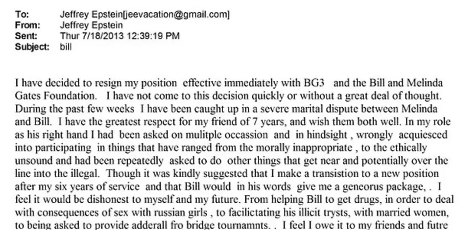 «Στον ρόλο μου ως δεξί του χέρι, μου έχει ζητηθεί -και λανθασμένα έχω συναινέσει- να συμμετάσχω σε πράγματα που κυμαίνονται από το ηθικά ακατάλληλο έως το δεοντολογικά επισφαλές, και μου έχει επανειλημμένα ζητηθεί να κάνω πράγματα που πλησιάζουν, και ενδεχομένως ξεπερνούν, τα όρια της παρανομίας… Από το να βοηθήσω τον Μπιλ να προμηθευτεί ναρκωτικά, προκειμένου να αντιμετωπίσει τις συνέπειες σεξουαλικών σχέσεων με Ρωσίδες, μέχρι τη διευκόλυνση των παράνομων σχέσεών του με παντρεμένες γυναίκες, καθώς και το να μου ζητηθεί να παρέχω Adderall για τουρνουά μπριτζ, δεδομένου ότι είμαι γιατρός αλλά δεν έχω καμία δυνατότητα συνταγογράφησης» αναφέρει στο μέιλ, στο οποίο προς το παρόν δεν επιβεβαιώνεται καμία πληροφορία από αυτές που αναφέρει.