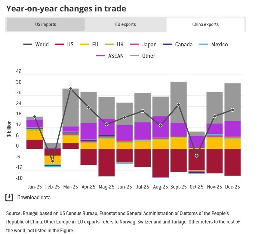 Η Κίνα, με την επιβολή αμερικανικών δασμών, είδε τις εξαγωγές προς τις ΗΠΑ να μειώνονται κατά 45%, αλλά αντιστάθμισε τις απώλειες με αυξημένες εξαγωγές σε Ασία, Λατινική Αμερική και ΕΕ, σημειώνοντας συνολική ετήσια αύξηση εξαγωγών 6,6% (22 δισ. δολάρια) έως τον Δεκέμβριο του 2025. Σημαντικός μοχλός ήταν οι αγορές του ASEAN-7 και η Αφρική, μερικώς αντικαθιστώντας την παραδοσιακή εξάρτηση από τις ΗΠΑ.