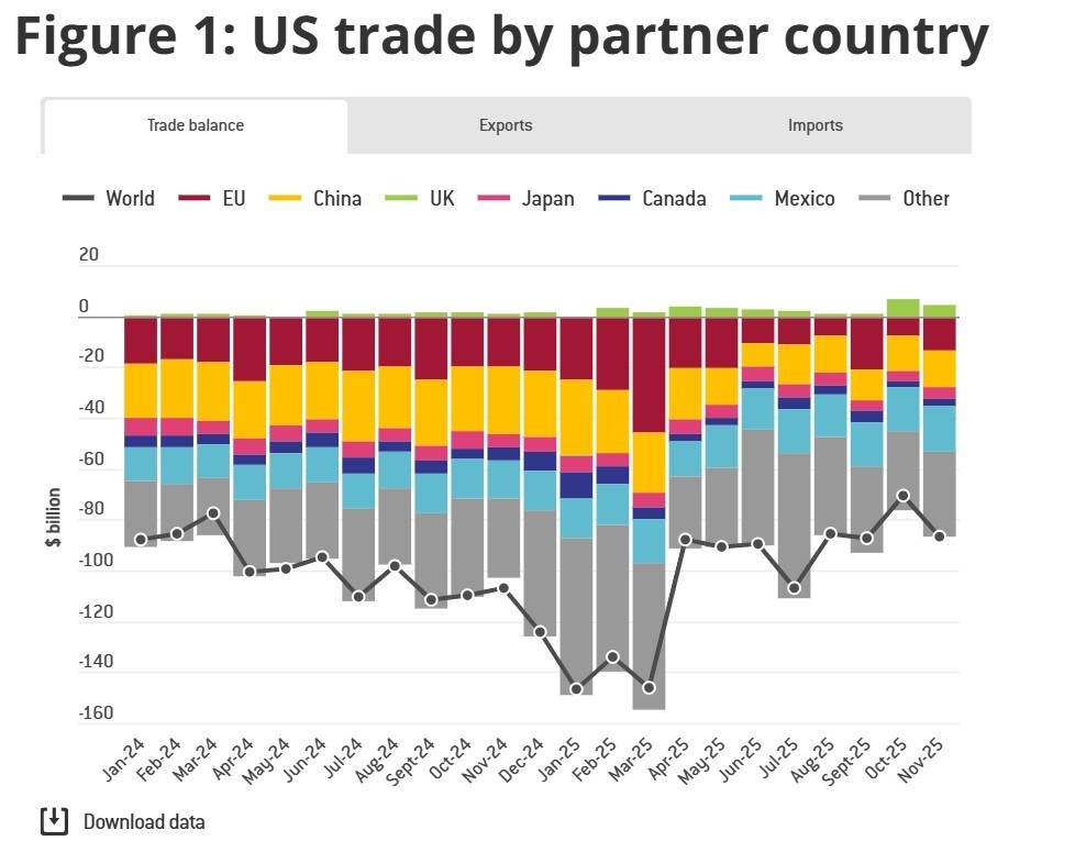 Σύμφωνα με στοιχεία του Ινστιτούτου Bruegel, οι εξαγωγές της ΕΕ προς τις ΗΠΑ μειώθηκαν κατά 4% έως τον Νοέμβριο του 2025, ωστόσο η συνολική αύξηση των εξαγωγών προς άλλες αγορές – όπως το Ηνωμένο Βασίλειο, η Νορβηγία, η Ελβετία και η Τουρκία – υπεραντιστάθμισε τη μείωση. Παράλληλα, οι εξαγωγές της ΕΕ σε πραγματικούς όρους έφτασαν σε ρεκόρ 3,6% υψηλότερα το τρίτο τρίμηνο του 2025 σε σύγκριση με το 2024.