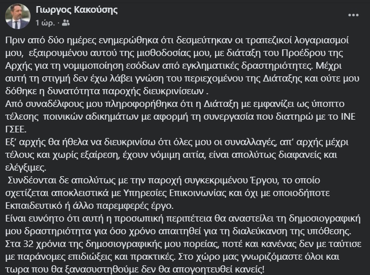 Σε μια σημαντική παρέμβαση μέσω Facebook, ο δημοσιογράφος της ΕΡΤ, Γιώργος Κακούσης, τοποθετείται για τις κατηγορίες που τον εμπλέκουν στην υπόθεση Παναγόπουλου της ΓΣΕΕ και ανακοινώνει την αναστολή της δημοσιογραφικής του δραστηριότητας για όσο διαρκέσει η διερεύνηση.