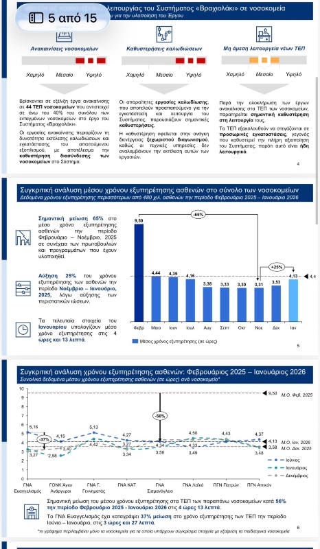 Τον Φεβρουάριο του 2025, ο μέσος χρόνος εξυπηρέτησης στα Τμήματα Επειγόντων Περιστατικών έφτανε τις 9,5 ώρες. Μέχρι τον Νοέμβριο του ίδιου έτους είχε περιοριστεί στις 3,31 ώρες. Πρόκειται για μείωση 65% μέσα σε εννέα μήνες.