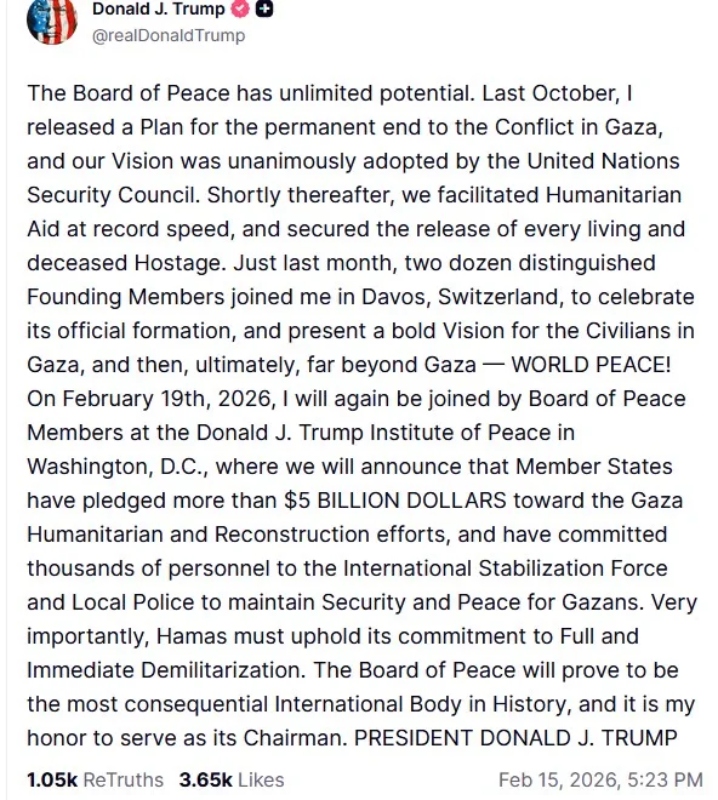 Σε μια κρίσιμη στιγμή για το παγκόσμιο πολιτικό σκηνικό, ο πρόεδρος των ΗΠΑ Ντόναλντ Τραμπ ανακοίνωσε μέσω της πλατφόρμας Truth Social ότι τα κράτη-μέλη του Συμβουλίου Ειρήνης έχουν δεσμευτεί να διαθέσουν πάνω από 5 δισεκατομμύρια δολάρια για ανθρωπιστική βοήθεια και ανασυγκρότηση στη Λωρίδα της Γάζας. Η ανακοίνωση αυτή σηματοδοτεί προσπάθεια επανατοποθέτησης της αμερικανικής διπλωματίας στο επίκεντρο των περιφερειακών εξελίξεων, υπογραμμίζοντας ταυτόχρονα τη δέσμευση της Ουάσιγκτον σε δράσεις σταθερότητας και στήριξης του πληθυσμού που δοκιμάζεται από τον συνεχιζόμενο πόλεμο.