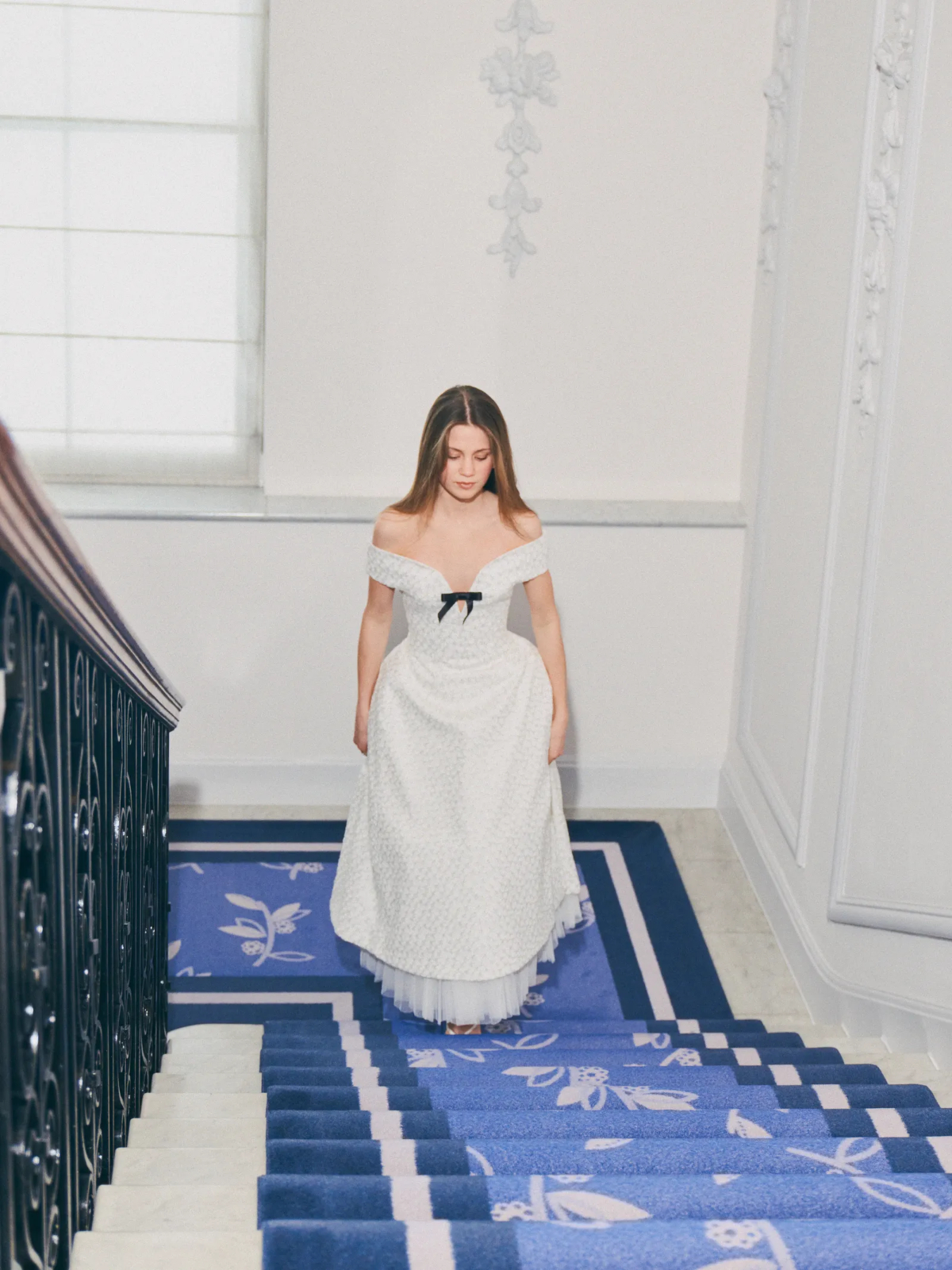 Για το πρώτο της premiere look, η Charlotte επέλεξε ένα λευκό off-the-shoulder φόρεμα Shushu/Tong, με μαύρη κορδέλα, σε μια επιλογή που ισορροπούσε ανάμεσα στη νεανική καθαρότητα και την επίσημη στιγμή χωρίς υπερβολές. Το styling ολοκληρώθηκε με λευκά strappy πέδιλα με χαμηλό τακούνι, σε μια εικόνα που έμοιαζε συνειδητά ήρεμη μέσα στο θόρυβο της πρεμιέρας.