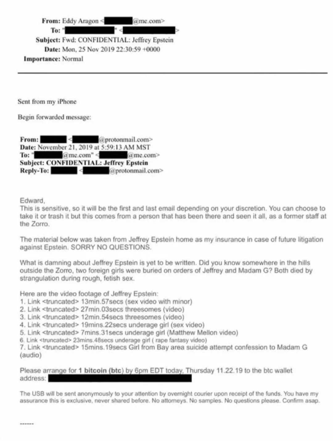 Το επίμαχο email, όπως περιγράφεται, είχε σταλεί λίγους μήνες μετά τον θάνατο του Έπσταϊν το 2019 στον Έντι Αραγκόν, ραδιοφωνικό παραγωγό στο Νέο Μεξικό, ο οποίος είχε αναφερθεί στο Zorro Ranch στην εκπομπή του. Ο αποστολέας ισχυριζόταν ότι ήταν πρώην εργαζόμενος στο ράντσο και ζητούσε πληρωμή σε κρυπτονόμισμα, υποστηρίζοντας ότι διαθέτει υλικό που θα μπορούσε να εμπλέκει τον Έπσταϊν σε εγκληματική δράση.