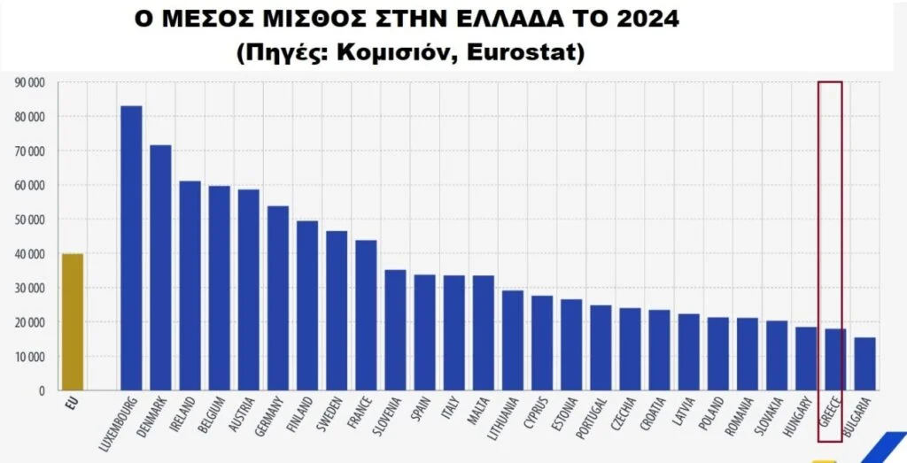 Ακόμη πιο δηλωτικός είναι ο μισθός πλήρους απασχόλησης. Στα στοιχεία της Eurostat για το 2024, η μέση ετήσια «προσαρμοσμένη» αμοιβή πλήρους απασχόλησης στην Ελλάδα τοποθετείται στον πάτο της ευρωπαϊκής κατάταξης, με τη χώρα να βρίσκεται δεύτερη από το τέλος, πάνω μόνο από τη Βουλγαρία, σύμφωνα με δημοσιευμένα στοιχεία που βασίζονται σε δεδομένα Eurostat.