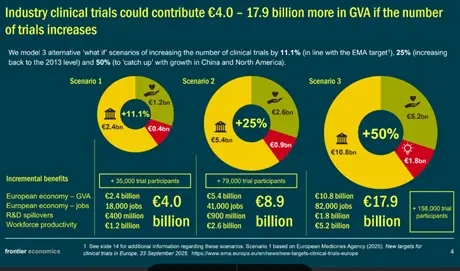 Σήμερα, οι κλινικές μελέτες που χρηματοδοτούνται από τη βιομηχανία αποτελούν ήδη έναν ισχυρό πυλώνα για τον Ευρωπαϊκό Οικονομικό Χώρο (ΕΟΧ), παράγοντας αξία ύψους 35,7 δισ. ευρώ ετησίως. Η αξία αυτή αναλύεται ως εξής: