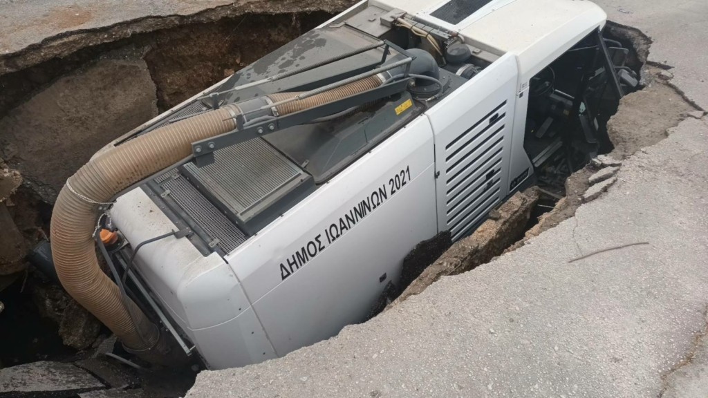 «Άνοιξε η γη» στα Ιωάννινα: Μεγάλη καθίζηση «κατάπιε» όχημα καθαριότητας του Δήμου