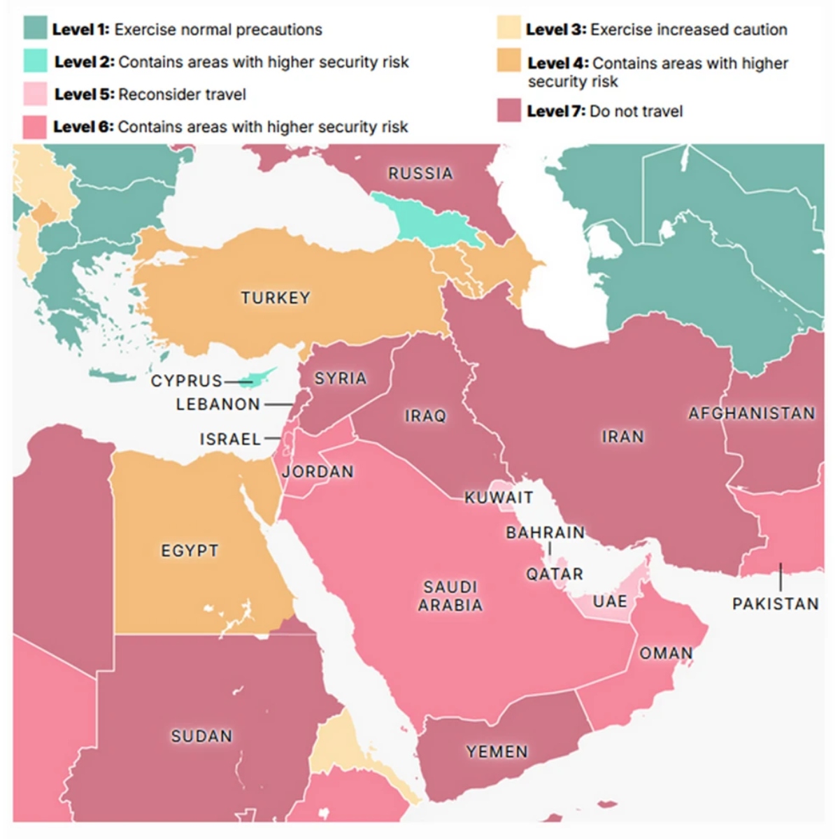 Οι Ηνωμένες Πολιτείες χρησιμοποιούν σύστημα αξιολόγησης κινδύνου με επίπεδα απειλής από το Level 1 (άσκηση κανονικής προσοχής) έως το Level 7 (μην ταξιδεύετε). Με την κλιμάκωση της σύγκρουσης, αρκετές χώρες της Μέσης Ανατολής κατατάσσονται πλέον στις υψηλότερες κατηγορίες κινδύνου.