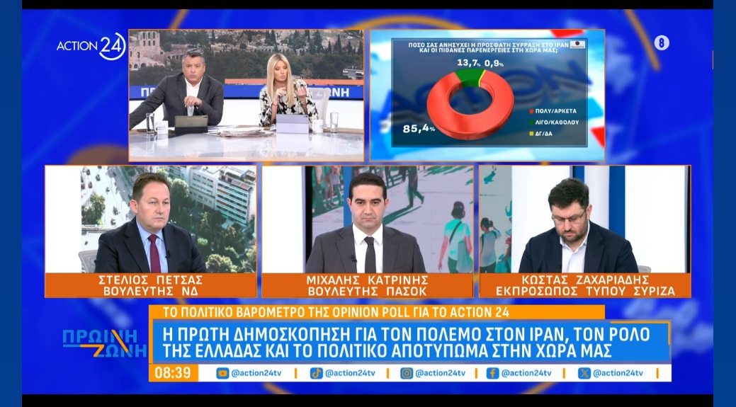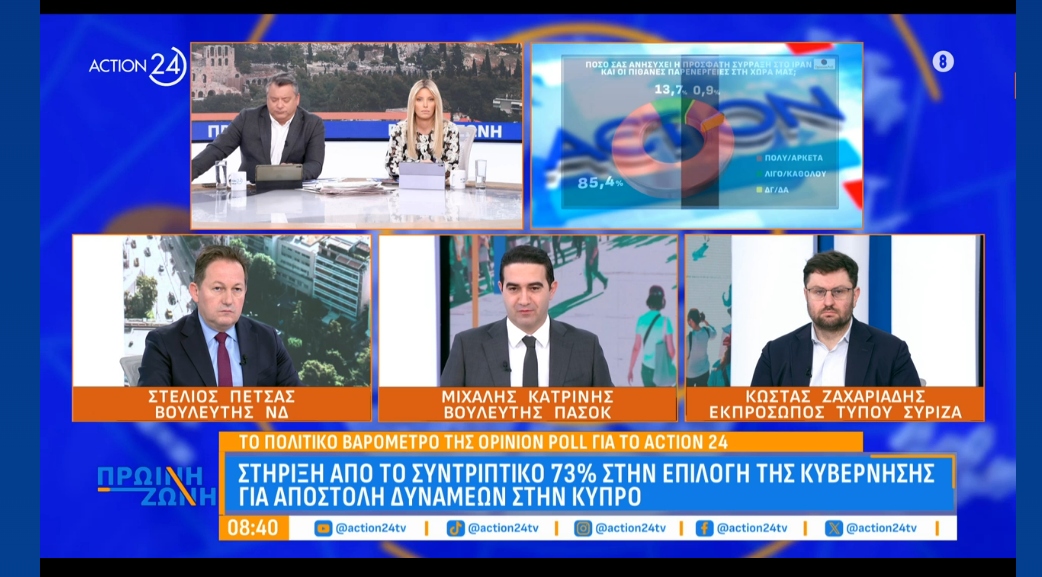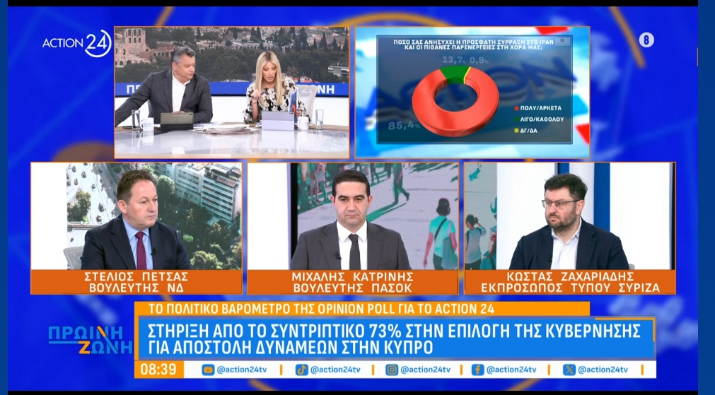 «Μιλήσαμε για τα αντανακλαστικά, και μπορεί να συμφωνεί το 73% με την αποστολή των δυνάμεων στην Κύπρο και με τη βοήθεια της Ελλάδας στην Κύπρο. Υπάρχει όμως και ένα 85,4% που ανησυχεί για τις παρενέργειες και τις επιπτώσεις στη χώρα μας από τη σύγκρουση στο Ιράν».