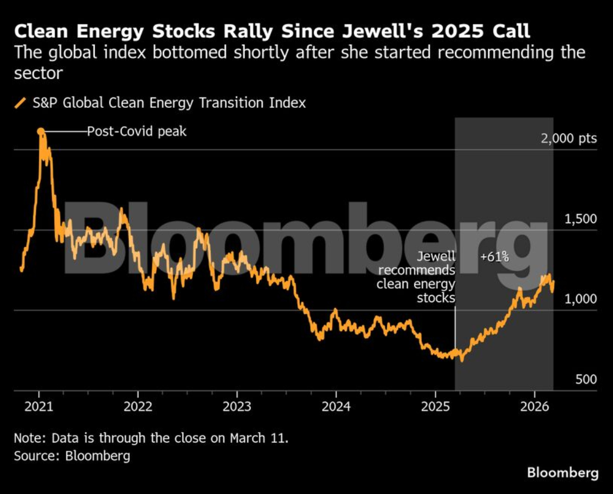 Για την Χέλεν Τζούελ, Chief Investment Officer (CIO) Fundamental Equities για την Ευρώπη, Μέση Ανατολή και Αφρική στη BlackRock –και πρόσφατα με αρμοδιότητα και στην Ασία-Ειρηνικό–, η στιγμή αυτή ήταν ιδανική για να ποντάρει κόντρα στο ρεύμα. Μόλις ένα μήνα μετά την ορκωμοσία Τραμπ, η Τζούελ και η ομάδα της άρχισαν να συσσωρεύουν θέσεις σε εταιρείες καθαρής ενέργειας, πείθοντας σταδιακά πελάτες που αρχικά αμφισβητούσαν την κίνηση. Σήμερα, ο S&P Global Clean Energy Transition Index έχει καταγράψει εντυπωσιακή άνοδο 61% μέσα σε ένα χρόνο, ξεπερνώντας κατά πολύ την απόδοση 23% του S&P 500, το 39% των «Magnificent Seven» και ακόμα και τις μετοχές πετρελαίου, παρά το γεγονός ότι η τιμή του αργού ξεπερνά συχνά τα 100 δολάρια το βαρέλι λόγω των εξελίξεων στη Μέση Ανατολή.