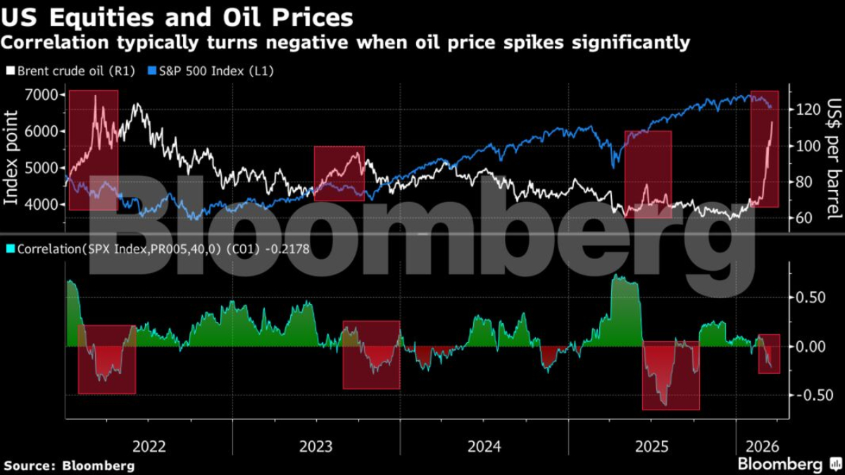 - Αρνητική συσχέτιση S&P 500 – πετρέλαιο: Όταν οι τιμές πετρελαίου αυξάνονται κατά ~30%, η συσχέτιση μεταξύ του δείκτη S&P 500 και του αργού γίνεται «όλο και πιο αρνητική».